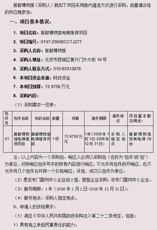 首都博物馆电梯维保项目采购公告