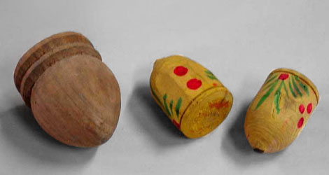 陀螺属于木制玩具,民间形象的称它为"抽汉奸"。陀螺的形状为倒圆锥形,倒锥体底端有一小眼儿,镶(xiāng)嵌有钢珠,便于在地面上旋转。它顶端为平面,可以涂上颜色丰富的彩条,旋转起来就会形成一幅美丽的图案。玩的时候把陀螺放在地上,用鞭子连续抽打,让它保持高速旋转,不让它倒下来,适合一人或多人玩耍,因此陀螺很受旧时北京男孩的喜爱。