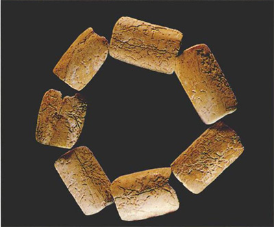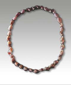 由50枚生长于海滨的蜒螺组成,大小相当匀称,最大的长1.8厘米、宽1.6厘米、厚1.1厘米,最小的长1.15厘米、宽0.8厘米、厚0.6厘米。每个螺壳的顶部都有磨成的小孔,用绳索串联起来,成为一件美观的装饰品。