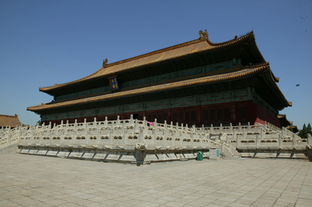 太庙主要建筑集中在第二层院落中。穿过一道琉璃门,跨过一字排开的7座汉白玉石桥,便是戟门了。戟门内外各陈列着朱漆戟架4座,每架上插放镀金银铁戟15只,总共有120只戟,威严而有气势,足以体现皇家的派头。跨入戟门,迎面看到的就是金碧辉煌的正殿,这里是皇帝举行祭祖大典礼仪的场所,之后便是中殿和后殿。