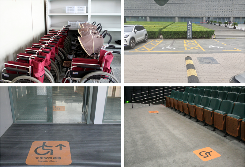 为了方便残疾人参观,我馆设定了无障碍参观路线,自北门入馆至东门出馆及主要展区均设置了无障碍坡道。为给残疾人提供停车服务,我馆按照标准在停车场设立了无障碍专用停车位,并由专人引导停车。因特殊人群的需求,北大门设立了无障碍安检入口、无障碍寄存柜,寄存处可提供轮椅租借服务,商品销售区实现了无障碍刷卡消费,在无障碍绿色通道沿途增加了醒目的标识。对数字放映厅设置了无障碍观影区,临时展厅及各出入口进行了无障碍设施改造和完善。