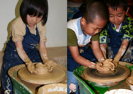 小朋友在陶艺坊制作陶罐