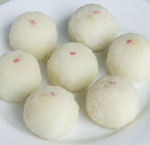 用洗净泡透的糯米,经蒸熟,捣烂,揉团,揪剂,包以馅心,团成球形,滚粘熟大米粉而成。色泽洁白如霜,质地细腻柔韧,馅心松散香甜。馅心主要有芝麻白糖、澄沙、枣泥等。(编写:朱锴)