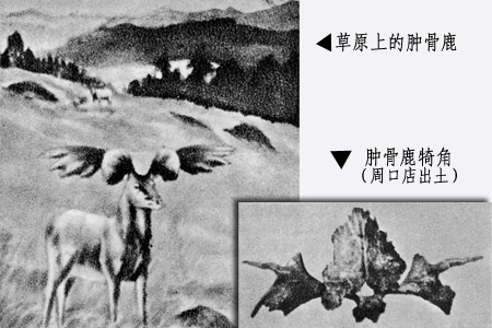 你们看它头上这犄角是太大,太重了。跑起来就不会很快,再说当时山上、地上有很多树,有很高的草,当人们追它的时候,它越急着跑,就越容易被树,被草挡住,或者缠住这大犄角,鹿就跑不动了,就被北京人活捉了。