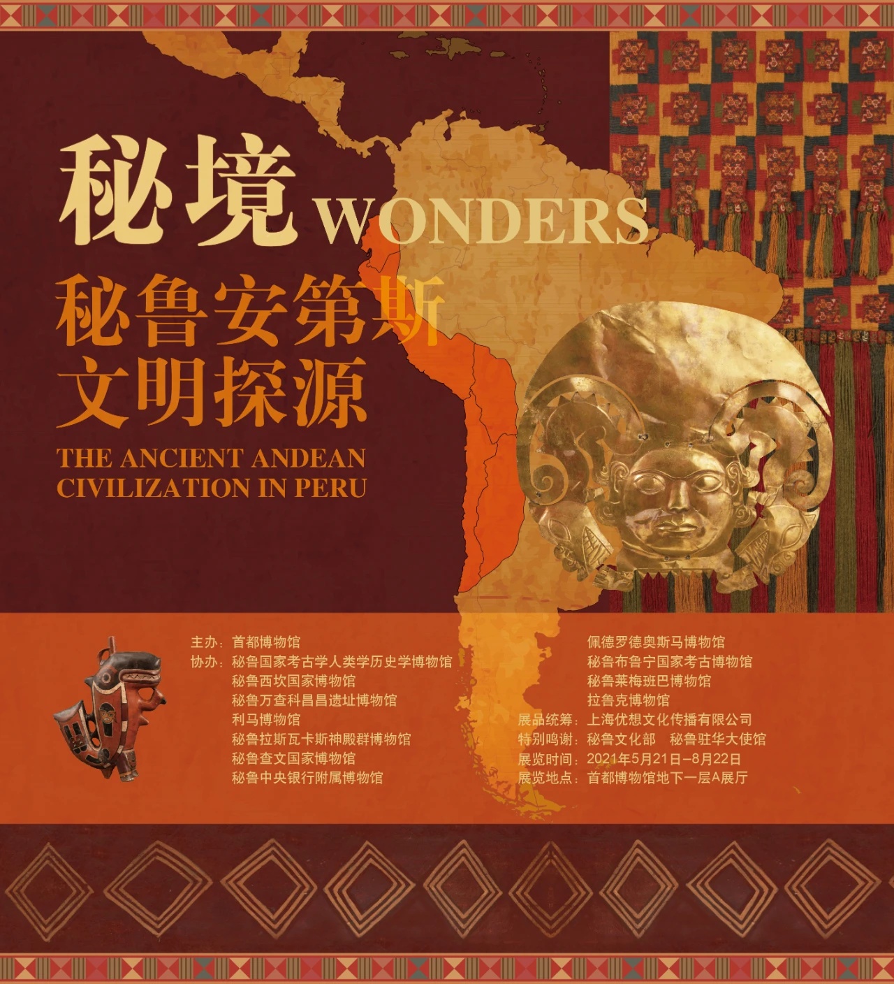 由秘鲁文化部和6家中国博物馆共同主办、秘鲁11家博物馆协办的安第斯文明展终于来到中国之旅的最后一站。此次展览由多位从事考古学、人类学和艺术史方面国际专家策划并提供学术支持,他们在安第斯文明的研究领域都有一定的建树。重建没有文字记载的安第斯文明历史,我们唯一能够凭借的就是考古发现。秘鲁和国际考古学界的各个学派对这一段历史的解读不尽相同,最初的结论也往往被后来的新发现推翻,因此本次展览中秘鲁历史文化的分期、各文化的时间断代和观点论述,仅为迄今为止学术界对这一领域的一些观点。希望在中秘两国博物馆同仁的共同努力下,在整合各博物馆提供的详实资料、研究成果和深入解读的基础上,我们的展览能够让观众得以全面领略神秘而独特的秘鲁安第斯文明的历史和风采!