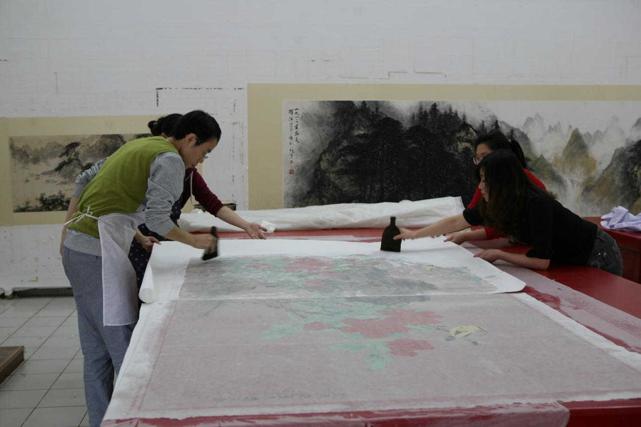 本次保护修复的8件巨幅书画艺术品主要是近现代古旧书画,均为近现代名家作品,在国外保存条件差,亟需修复。这些艺术品污损严重,除了普遍具有一定程度的污渍、霉渍、虫蛀、残缺、断裂外,还有多种病害。8件书画艺术品都破损严重,需要重新揭裱。经研究,字画组在保护方法和材料的选择上保证了其安全性和可再处理性原则,并尽量避免对未来的保护造成不利影响的保护处理,以便于为将来更先进的保护技术和更好的材料留下足够的空间。确保保护方法在科学分析调查、现场试验、效果评估的基础上完成。在保护修复中使用的材料和施工工艺经过了反复验证,以确保其有效性和可操作性、安全性。此次保护修复任务,修复人员按照严格的修复流程,充分发挥了团队作用。